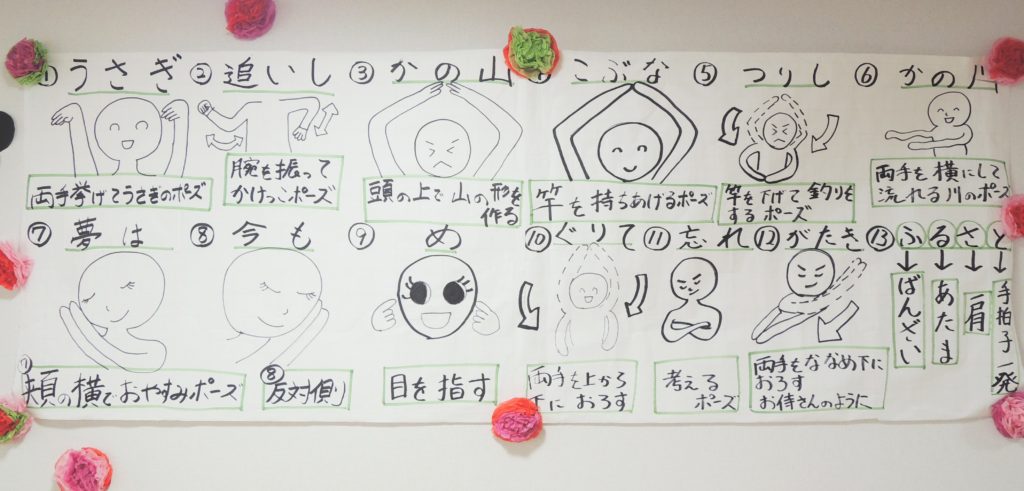 唱歌がお好きな患者さまが多いので、唱歌に合わせた体操も定期的に行っています。患者さまや病棟スタッフみんなで体操ができるようにと、スタッフが振付をイラストにしました。