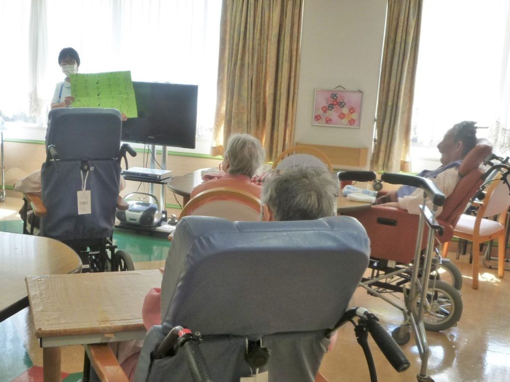 こちらを見ながら今日は「ふるさと」の歌に合わせた体操と・・・