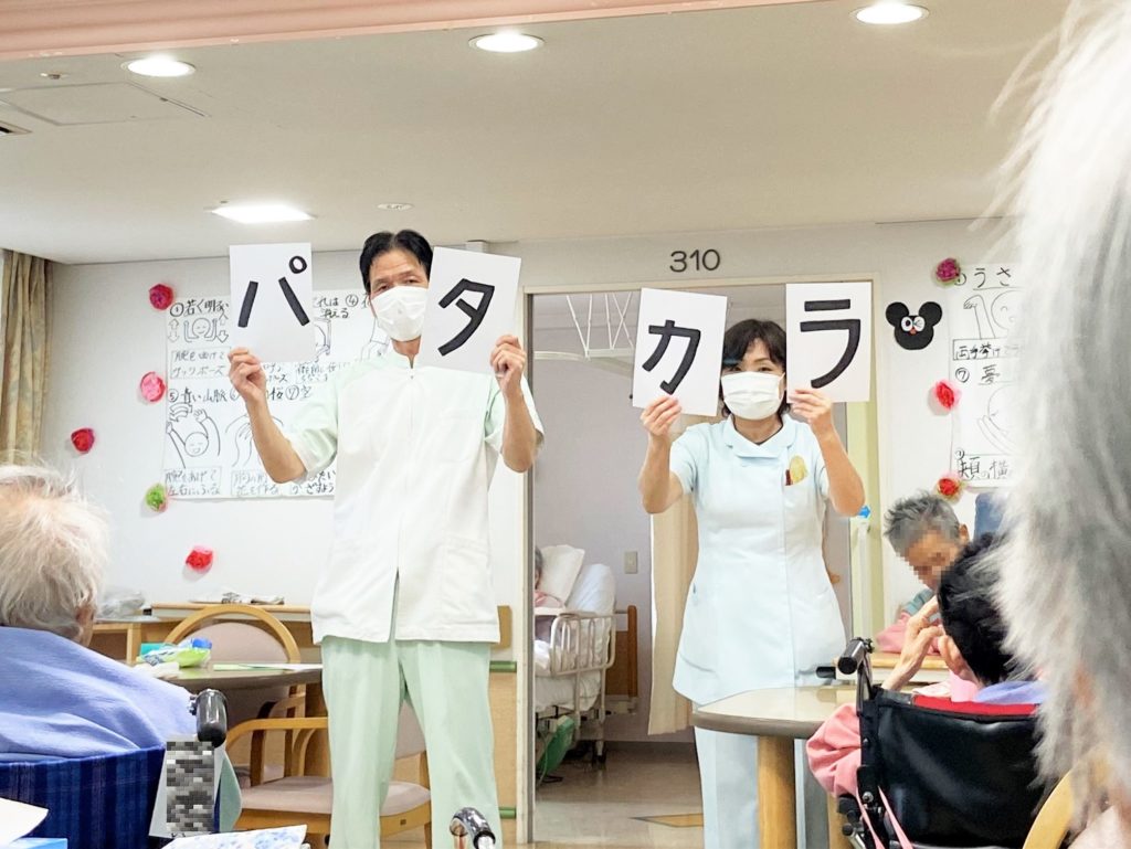 唱歌がお好きな患者さまが多いので、唱歌に合わせた体操も定期的に行っています。患者さまや病棟スタッフみんなで体操ができるようにと、スタッフが振付をイラストにしました。