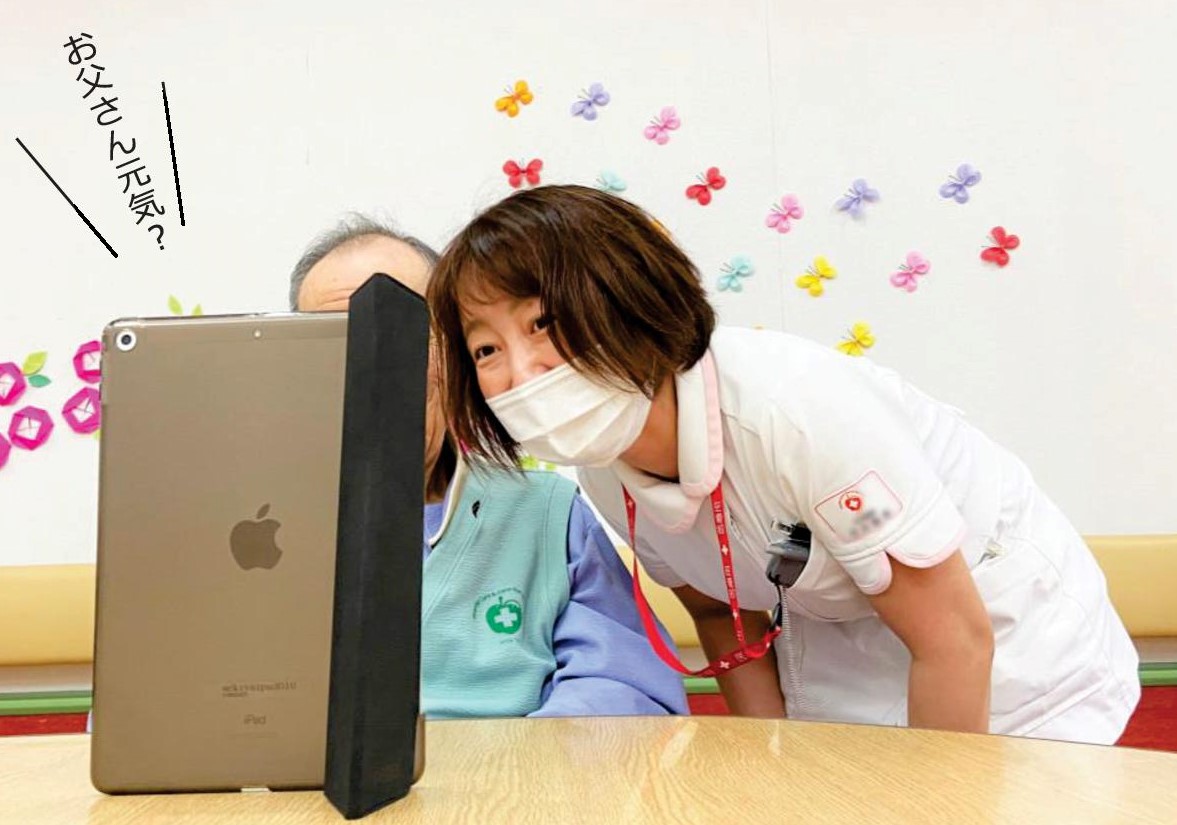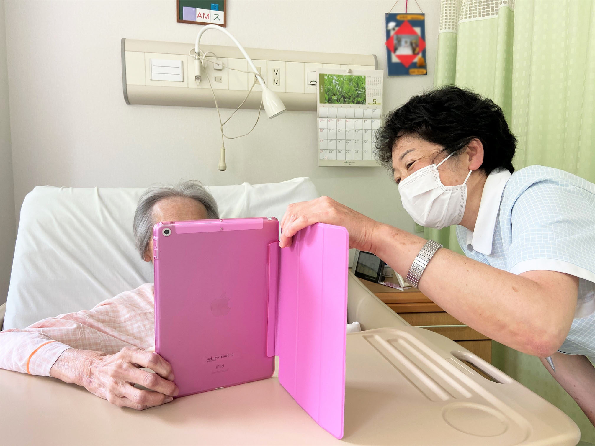 デジタル機器を使用したビデオ面会は1ヶ月で約160件のご利用がありました。ご家族さまとの久々のご対面に笑みがこぼれる患者さまや、ペットとのご対面で手を伸ばし画面ごしに撫でられる患者さまなど通信での面会をお楽しみいただいております。ご家族さまからは「元気そうで安心した」などのお声も頂戴いたしました。1回5分ほどの面会ですがこれからもどうぞご利用ください。
