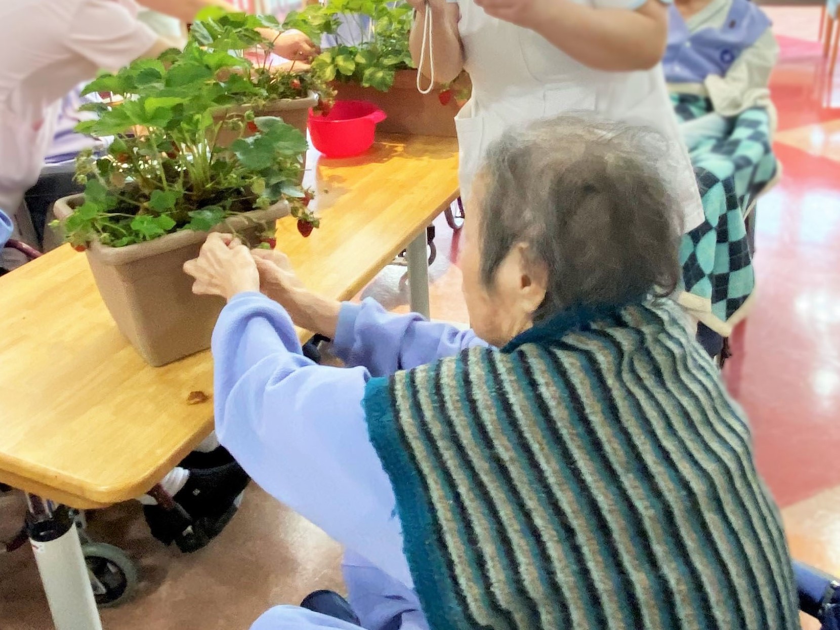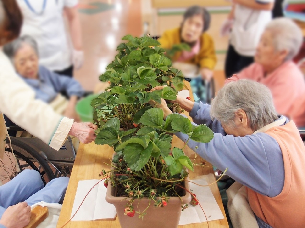 ハナミズキガーデン(こんごう棟中庭)では野菜や果物を育てています。いちごは今が旬!赤く熟した実がなるたびに病棟へプランターごと運び、患者さまにいちご狩りをしていただいています。「こんなに甘くて立派なイチゴができるなんて!」「お世話してくれている人のおかげやね」とスタッフに声をかけながら、いちごを味わっておられました。これからは患者さまと畑の水やりも行っていきます。
