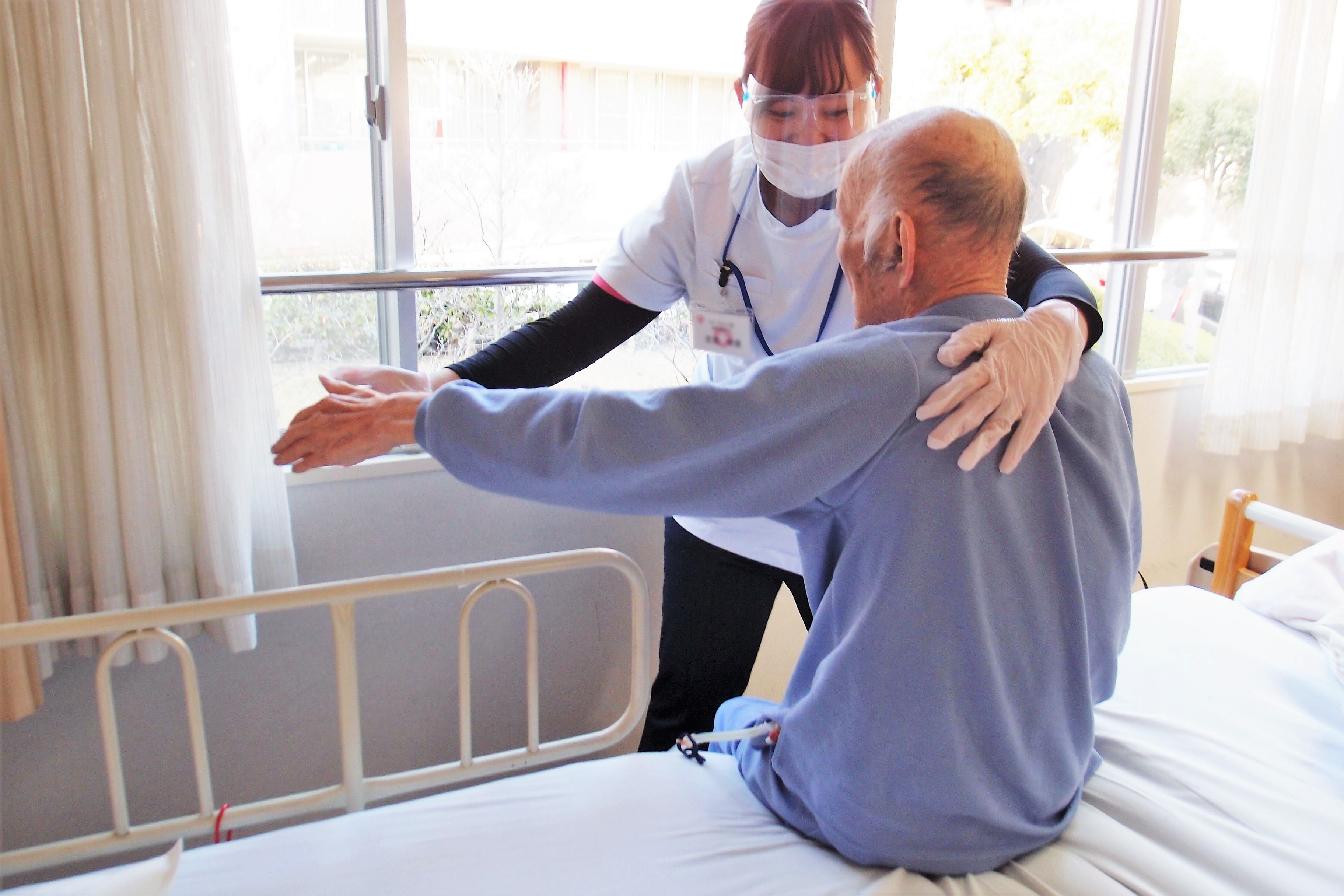 年齢を重ねると筋肉が縮み、弾力を失います。筋肉が硬くなると身体を動かしづらくなり、日常生活に影響を及ぼします。ストレッチは、身体機能の低下を防ぐ重要な運動です。また、食欲増進や血行促進の効果が期待でき、リラックス効果による睡眠の質の向上にも繋がります。患者さまの中には昼夜逆転の方や眠りが浅い方もいらっしゃるため、背伸びや上下肢の軽いストレッチなどで自律神経を整え睡眠の質の向上に繋げています。