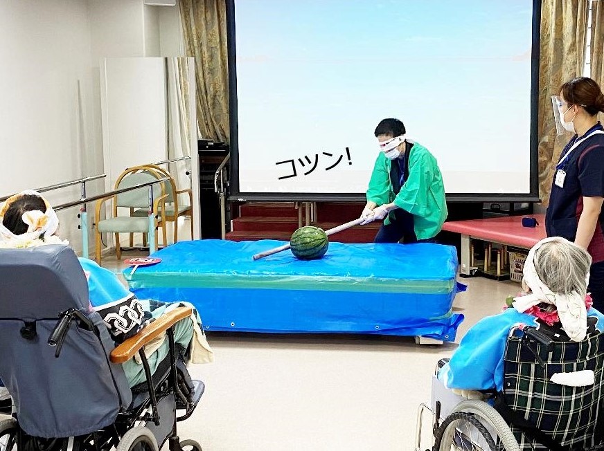 こちらのスイカ割りの様子は、7月17日(土)、各病棟に映像でご覧いただきます。
