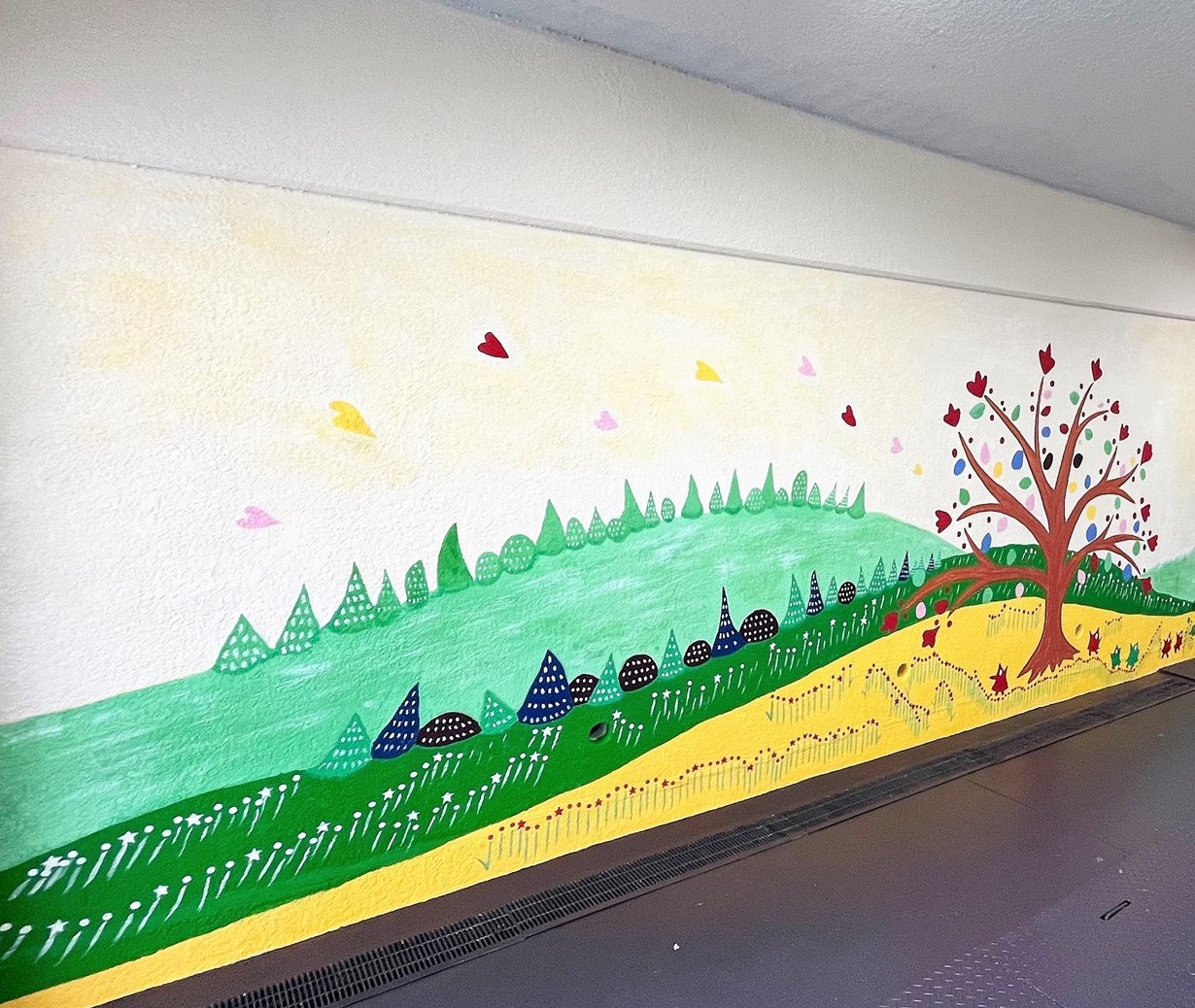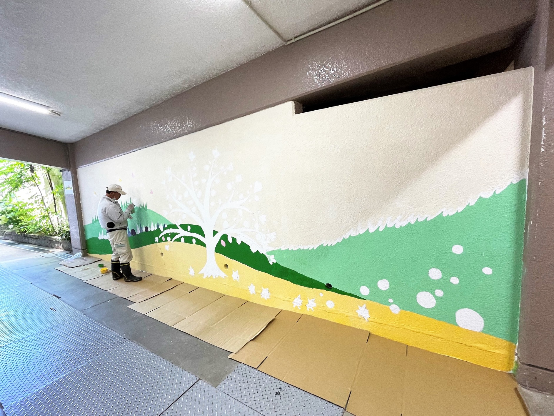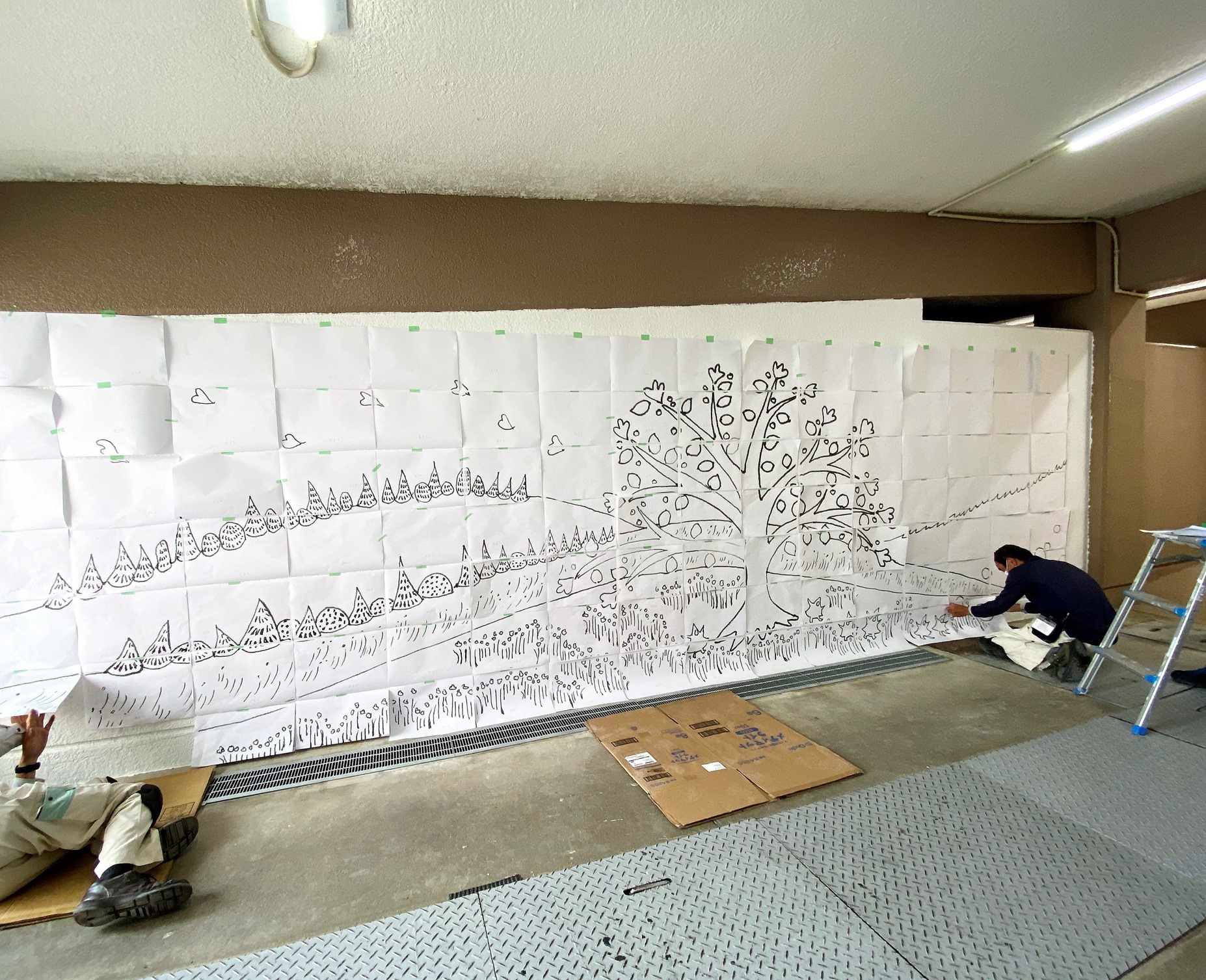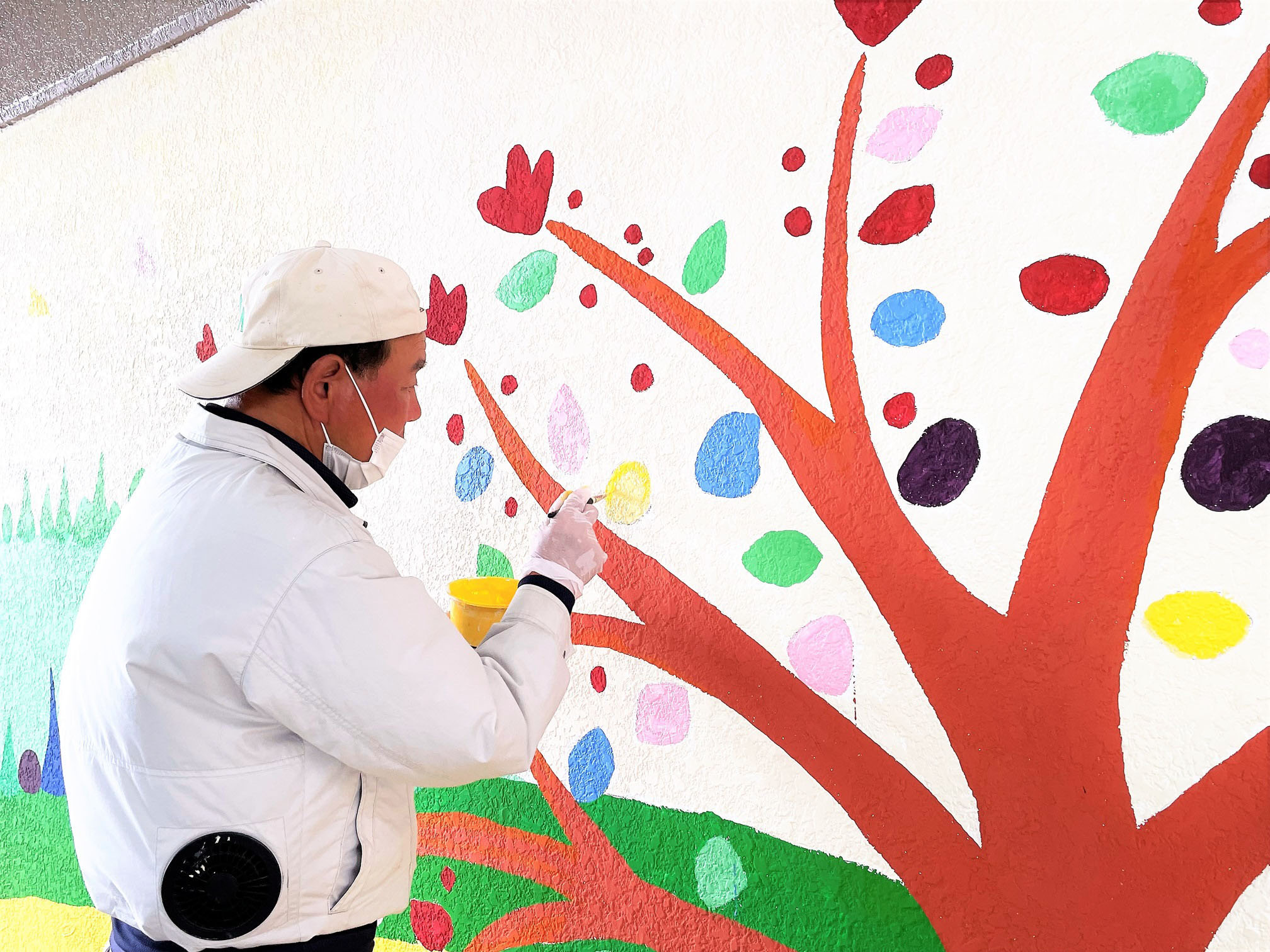 「通用口が明るく元気が出る場所になりますように」という思いが込められた絵に、当院スタッフが着彩しました。