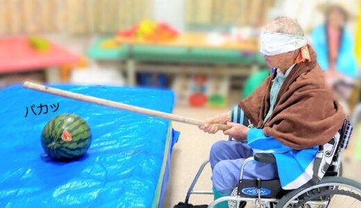 夏の風物詩でもある「スイカ割り大会」を、7月2日(金)に行いました。 まずは、目隠しをしたリハビリスタッフが、見本をお見せします。 スイカめがけて勢いよく棒を振り下ろします。「えいっ!」 「コ […]